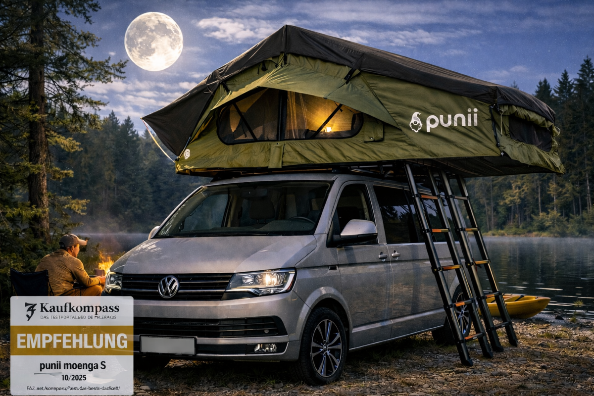 Das moenga XL ist das passende Dachzelt für Familien und alle, die viel Platz und Komfort unterwegs brauchen. Der Aufbau gelingt in unter fünf Minuten – beide Teleskopleitern ausziehen und das Zelt klappt sich selbstständig auf. Der große Vorbau sorgt für einen trockenen Einstieg, selbst wenn’s draußen schüttet. Innen erwartet dich eine 7 cm dicke Matratze für erholsamen Schlaf und die integrierte LED-Beleuchtung bringt Licht ins Abenteuer. Durch das Sternenfenster im Vorbau fällt selbst dann Tageslicht hinein, wenn das optionale Vorzelt geschlossen ist. Dank wetterfestem Material bleibt alles trocken, egal bei welchem Wetter. Mit einer Liegefläche von 220 cm bietet das moenga XL außergewöhnlich viel Raum – ideal für bis zu vier Personen, ob mit Kindern, Hund oder Lieblingsmenschen.