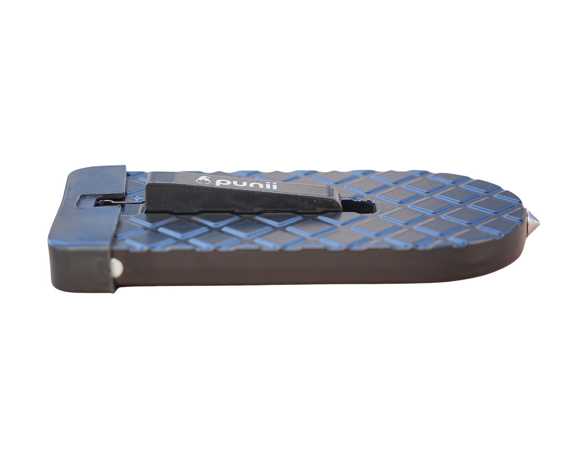 Ein cleveres Extra: An der Vorderseite befindet sich ein Sicherheitshammer aus Edelstahl, der im Notfall als Rettungswerkzeug zum Einschlagen von Scheiben genutzt werden kann.