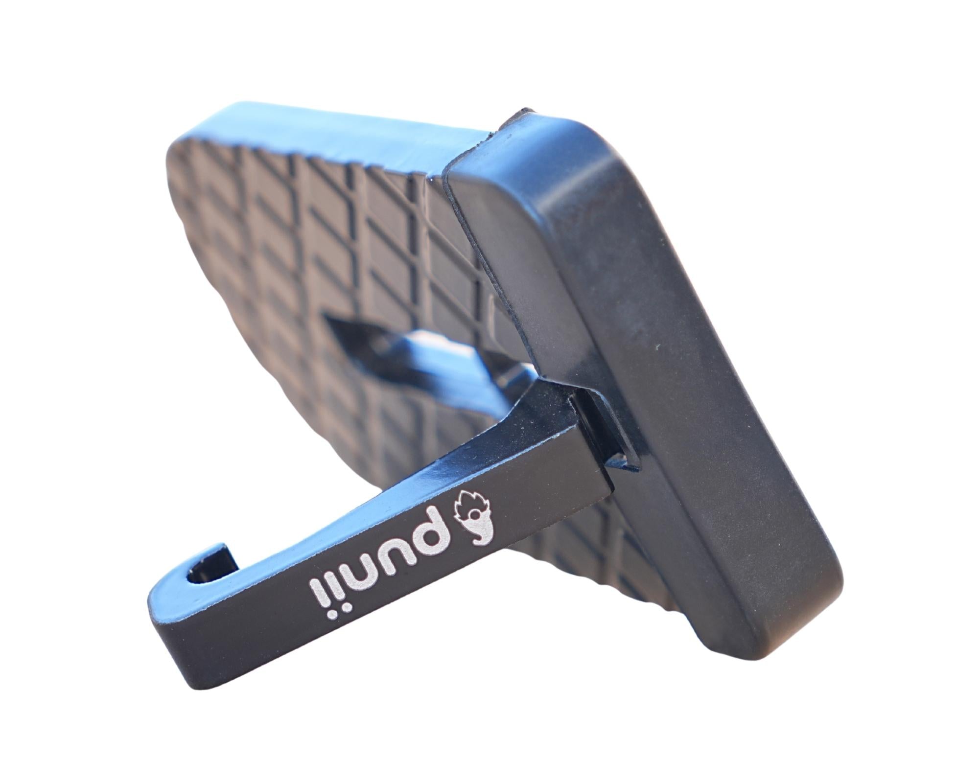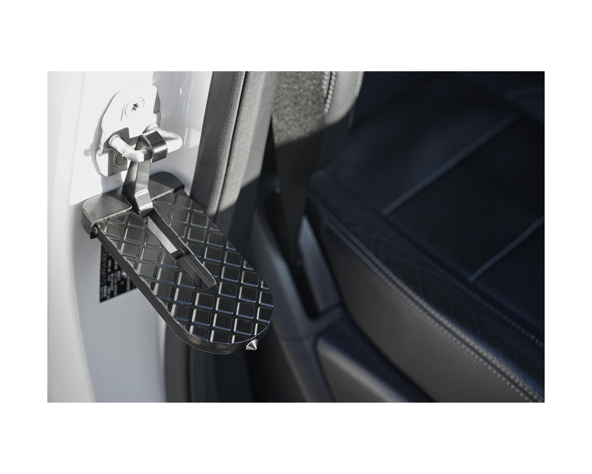Der Klapp-Haken wird in die Türöse eingesetzt, die gummierte Auflage stützt sich an der B- oder C-Säule ab. Unter Belastung entsteht so eine feste, rutschfreie Trittfläche, die nicht wackelt. Die Trittfläche ist rutschfest gerillt, zusätzlich schützt ein Gummiaufsatz den Lack an der Auflagekante.