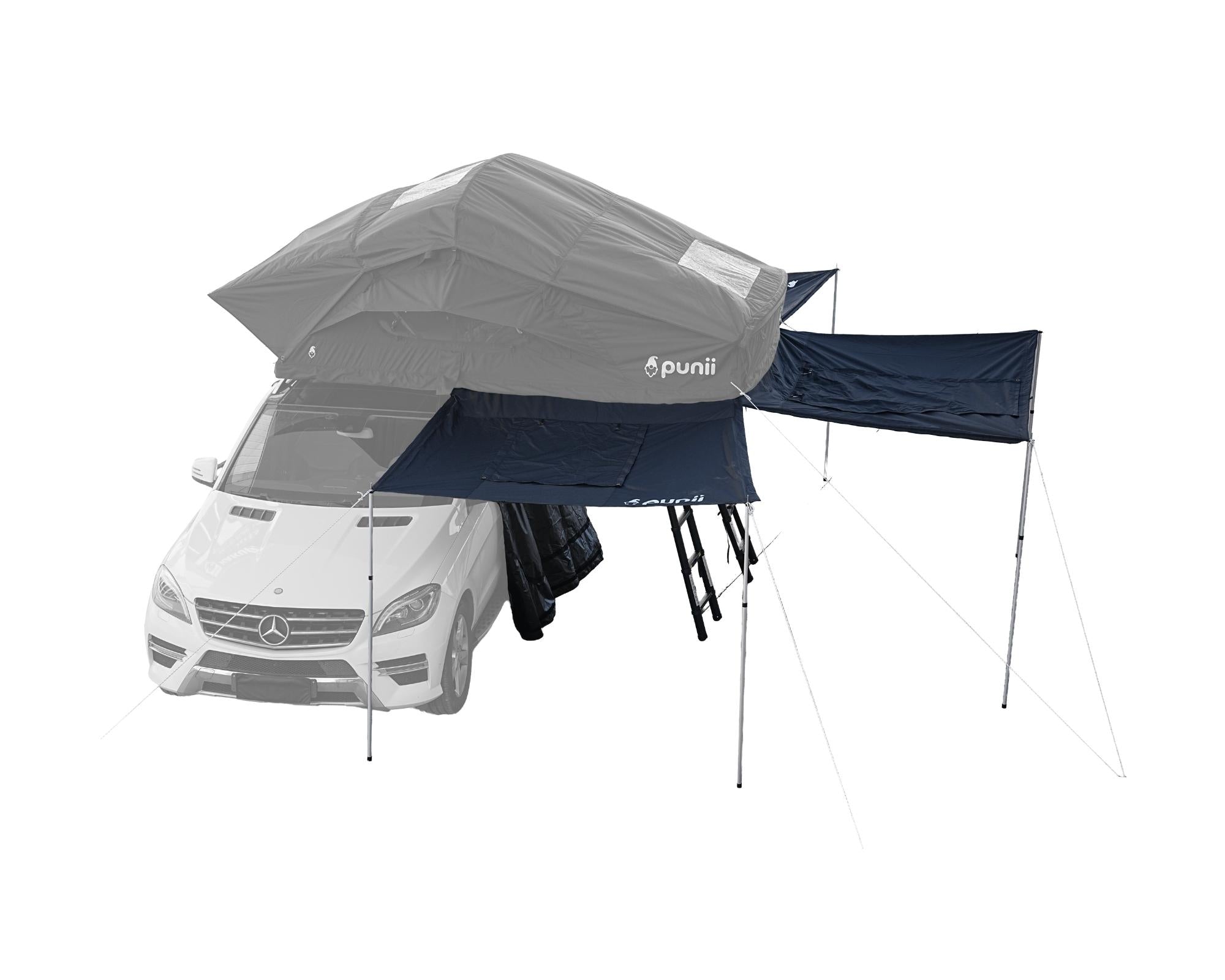 NEU: alle Seiten lassen sich wie ein Tarp aufstellen. Bei kleineren Autos lässt sich das Dachzelt durch Riemen um bis zu 30 cm verkürzen.